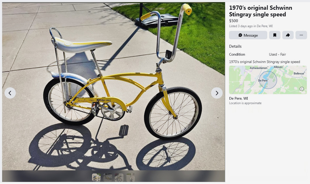 We’ve only seen Schwinn bicycles 10 times here on Barn Finds; that’s crazy. I would have bet anything that we had seen many more than that, but if nothing else, this is the very first single-speed Sting-Ray that we’ve seen. I’m guessing that most of us over the age of 30 or 40 grew up with a single-speed bike as our first one. This 1970s Schwinn Sting-Ray single-speed bike can be found listed here on Facebook Marketplace in De Pere, Wisconsin, and they’re asking $500. Here is the original listing, and thanks to Lothar… of the Hill People for the tip!