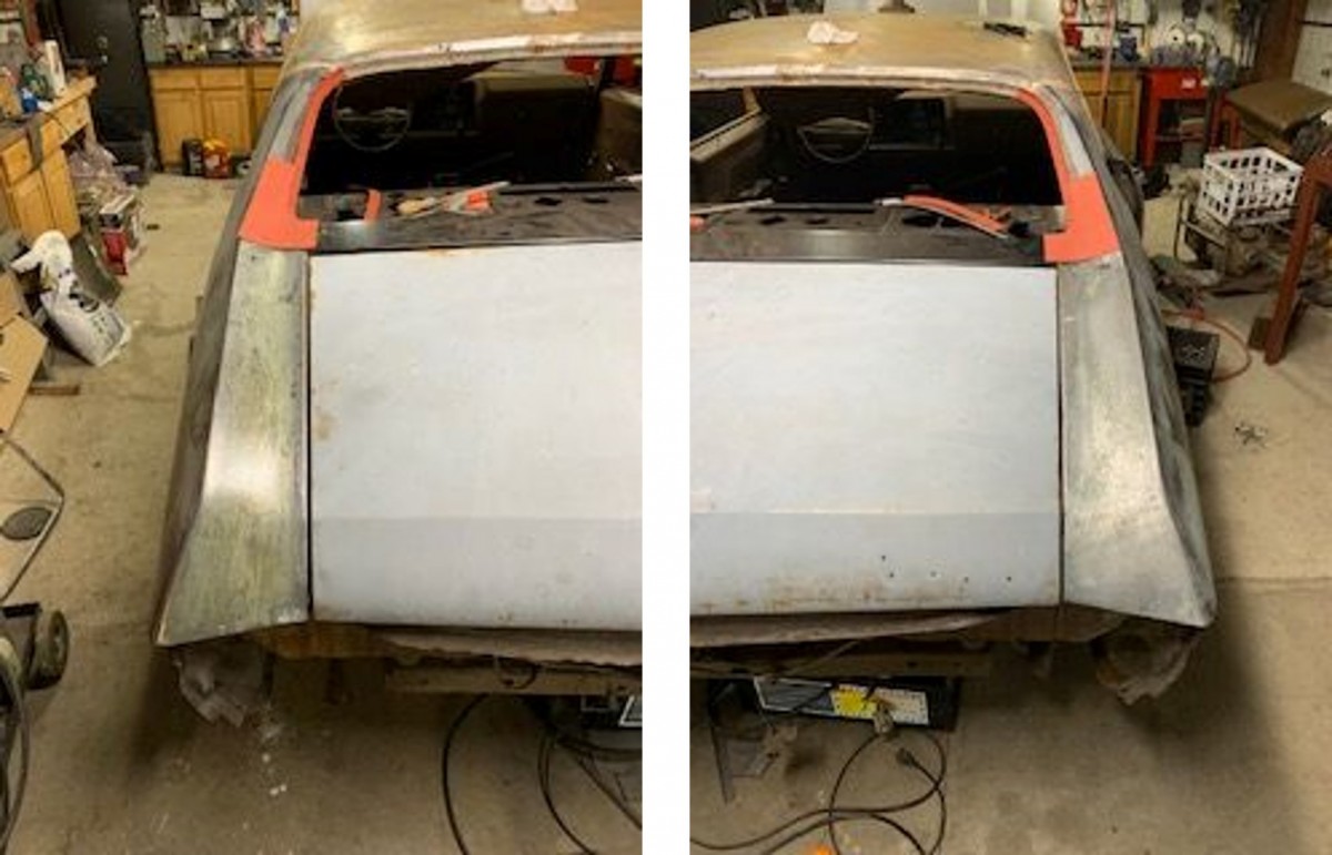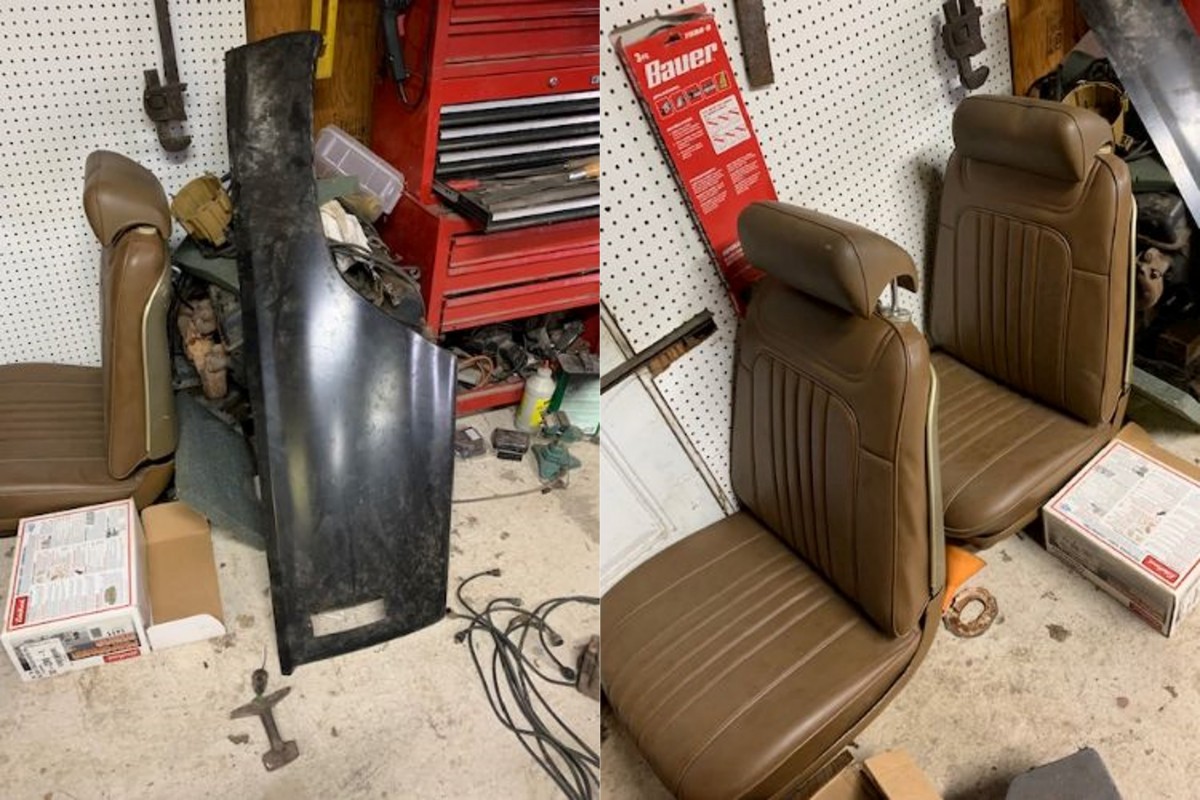 The seats already appear to be restored, and the patch panels seem to fit well where they have been clamped in place.