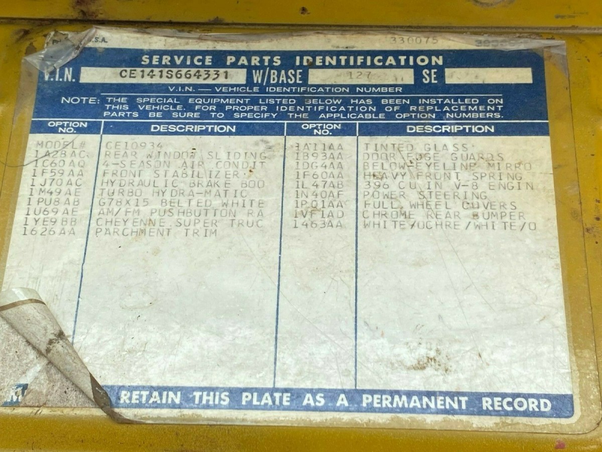 Back to this truck. The seller tells us they have owned the truck since April 2017 and that it’s a good driver. Some of the newer parts and service work completed on the truck include a replacement headliner, dash pad, and bed liner. There has also been a lot of suspension work done. The seller tells us that the truck was built at the St Louis plant and that they are including the dealer manual, GM Truck Order form (dealer copy) dated 05/05/71, and an authorized selling dealer plant imprint Protect-O-Plate in the sale.