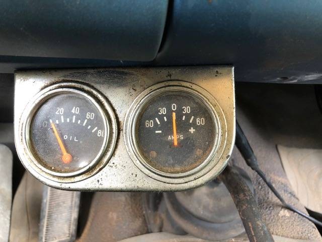 The front bench seat has always worn a cover, so the upholstery is perfect beneath it. There’s modest pedal wear, the dash is mildly faded but restorable, the glass and seals look fine. Two auxiliary gauges are installed below the instrument panel. Manuals include the owner’s handbook, a service booklet, and a shop reference.