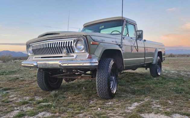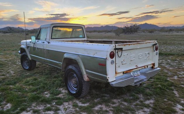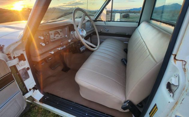 Clean and inviting, unlike me, this interior looks fantastic. It was dolled up at some point, and it looks great. You’ll notice there is a big brake pedal next to the accelerator (or gas) pedal, and no clutch pedal. This Gladiator has a GM-sourced Turbo-Hydramatic 400 three-speed automatic. The seat cover is new, as is the headliner, vinyl floor covering, and more. The dash is said to be new, but it has a cover and a couple of cracks in it, according to the seller. Jeep changed its model names a few times, and in this era, the J2000 had a short bed (120-inch) wheelbase, and the J4000, as seen here, has a 132-inch wheelbase. They do mention that some of the gauges aren’t working, but don’t go into detail on that.