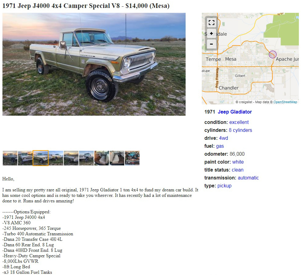 AMC’s marketing department was on the job, having enjoyed its share of interesting and popular vehicles over the previous few years. Champagne and avocados, I like it. This truck is another contender for 2026’s best photos list. There aren’t a lot of photos, but they hit the highlights, even including a rare-for-craigslist engine photo. By 1971, Jeep was owned by AMC, and the former small grille (my personal favorite) had gone away in favor of this cheshire grin grille.