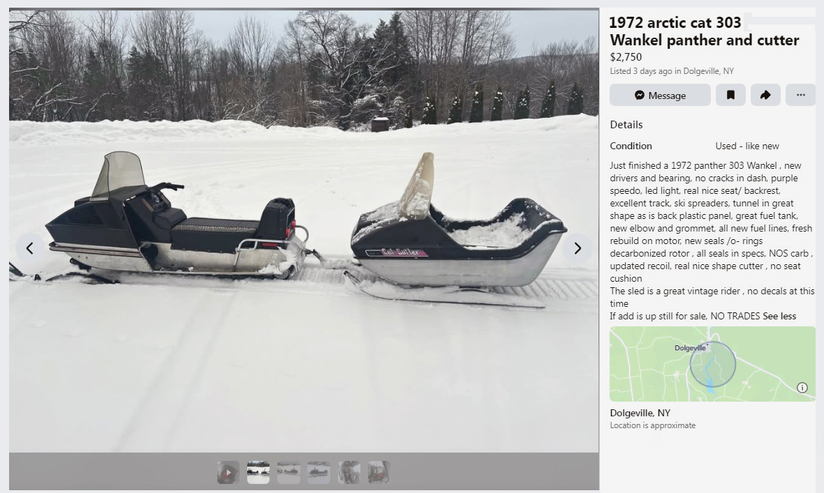 Combining vintage snowmobiles and Wankel engines?! Win-win, at least for the unusual factor. I’m trying not to overdo the vintage snowmobile thing here, but this 1972 Arctic Cat Panther with a 303 Wankel engine and Arctic Cat Cutter was just too good to pass up. It can be found here on Facebook Marketplace in Dolgeville, New York, and they’re asking $2,750. Here is the original listing, and thanks to Jeff C. for the tip!