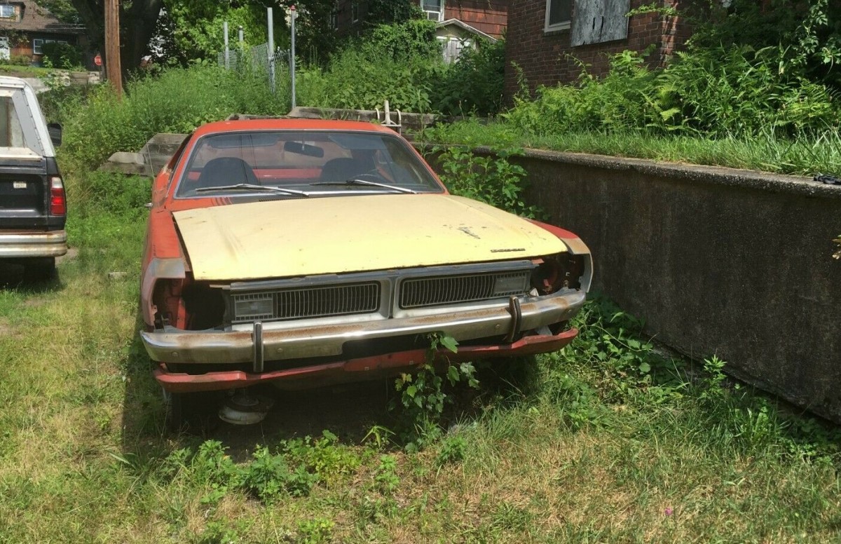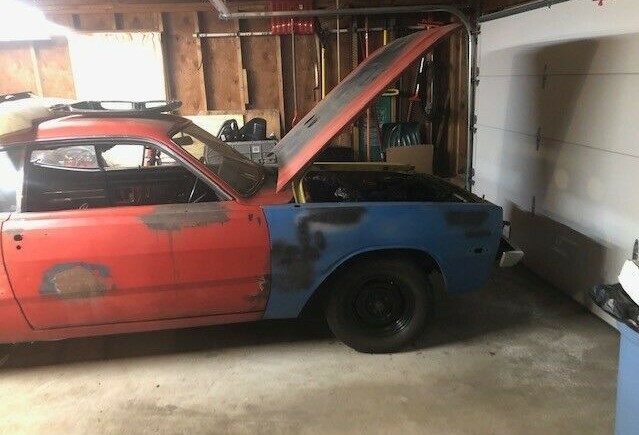 We don’t get a lot of details about this car, so we’ll have to largely go by the few photos provided. In one instance, it seems to be largely complete sitting outdoors and — in another – we see it inside a garage with the front clip off. So, when the buyer goes to pick it up, he might be carrying much of it away in boxes. The seller says the engine runs well, although we suspect it can’t be moved under its own power from where it rests. We’re told the Dodge comes with a lot of new parts, but we don’t know what those are. While the hood, which is of a different color, looks like a regular Dart hood, the seller says he has the original hood with two sets of hood scoops as well as two sets of front fenders.