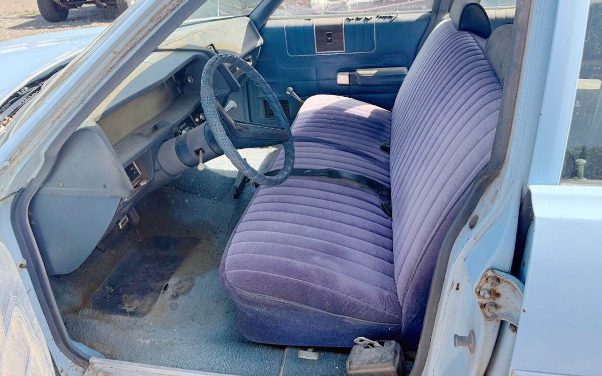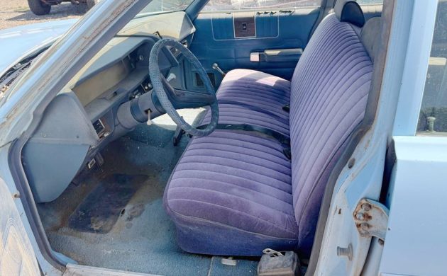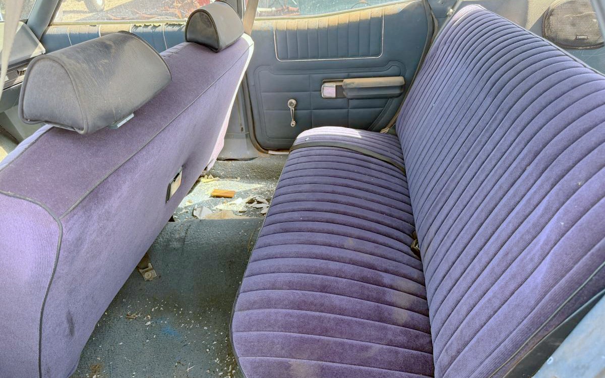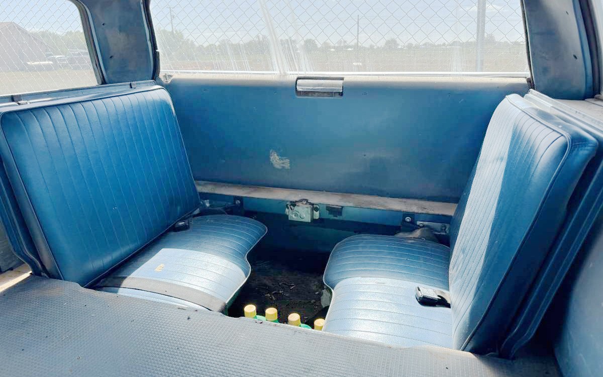The sun has a way of turning fabric seats purple. If any of you are engineers or meteorologists or whatever it takes to figure out why that is, please let us know. Our gray Subaru Outback seats turned a somewhat lesser shade of purple after a couple of decades, and it was weird. These velour seats aren’t original, of course; they used to be blue. The back seat looks the same, and this one has dual-facing rear seats with room for at least eight inside. I’m guessing the front two bench seats used to be a similar blue vinyl as shown on the rear seats. A power-operated tailgate window was standard equipment. Mice have gotten into this one, but we don’t know how much damage there is related to that.