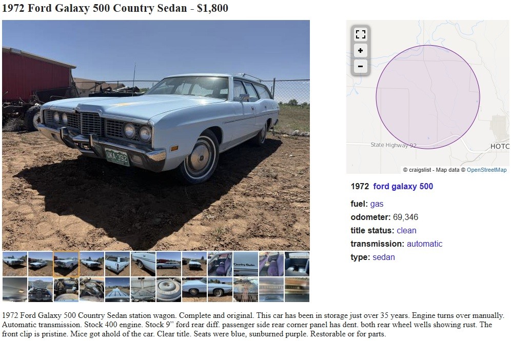 Ford’s Country Sedan is an unusual model as it’s a wagon, but Ford wasn’t immune to referring to its station wagons by other terms. Country Sedan, Ranch Wagon, Country Squire, etc. This 1972 Ford Galaxie 500 Country Sedan is posted here on craigslist in the Hotchkiss, Colorado area, and they’re asking $1,800. Wait, only $1,800?! Here is the original listing, and thanks to Tony P. for the tip!