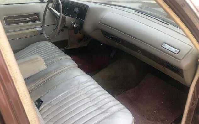 The 400 cid (6.6L) V8 looks as though it saw regular service and typical replacement parts including the monster-sized twin-circuit master cylinder. The inverted air cleaner cover is a poor-man’s performance trick of the day, allowing plenty of fresh air into the housing. It does bypass the exhaust manifold heater tube that’s designed to encourage smooth warm-up, but that tube is missing anyway. Belts on the air conditioning compressor normally indicate that the system worked in the recent past if not currently.