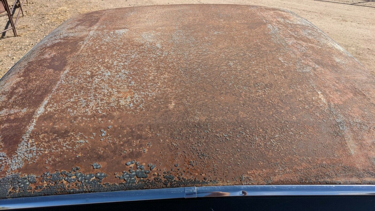 “Absolutely rust free” according to the seller. What is that hole at the bottom of the rear window/vinyl top moulding on drivers side in the last picture? Just asking.