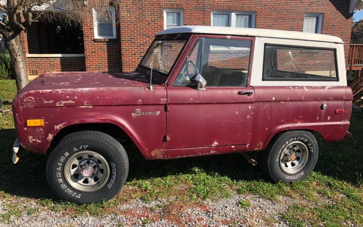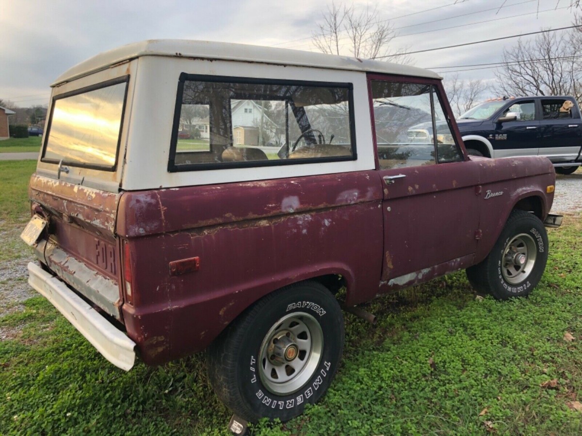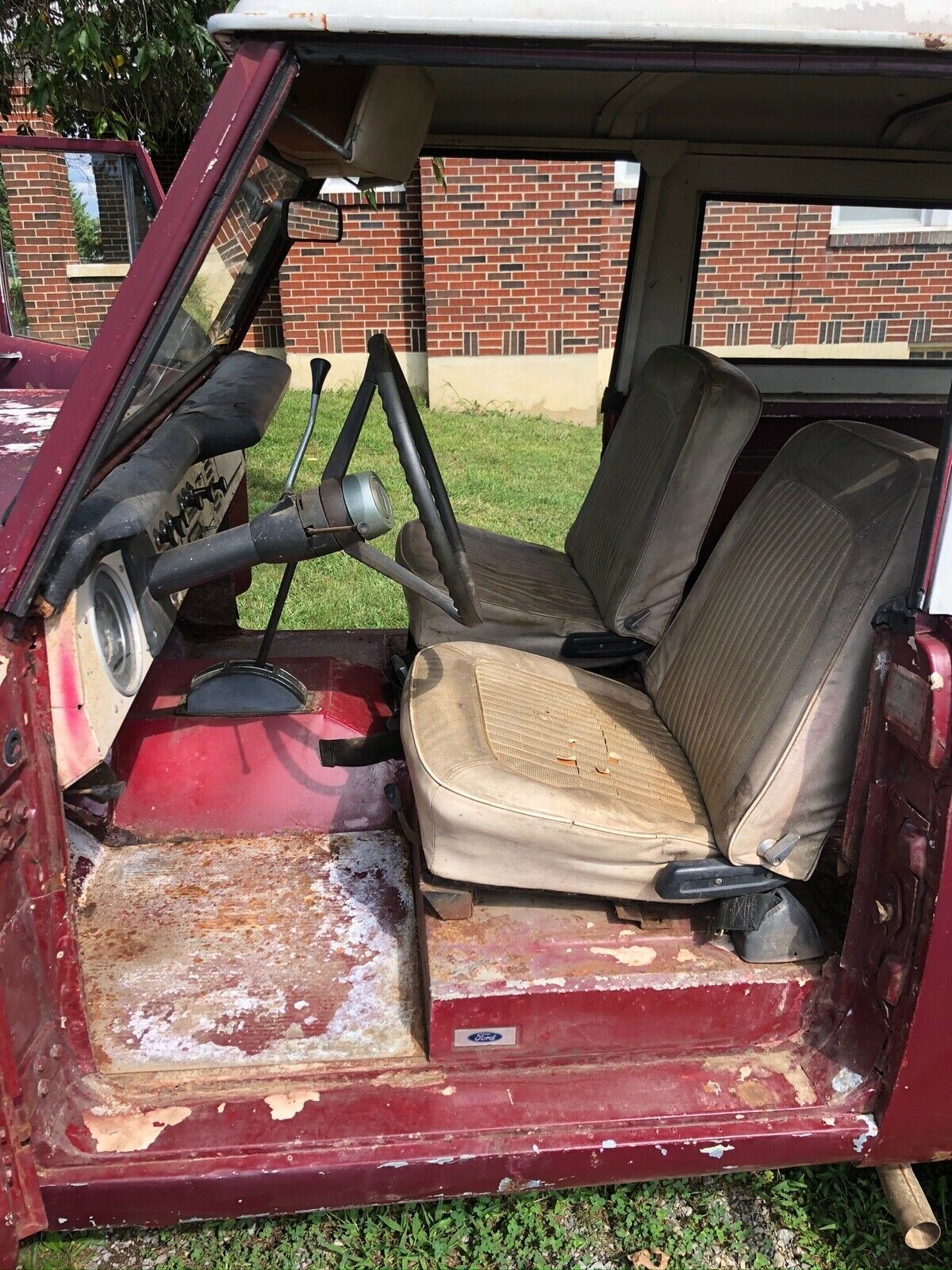 The parchment colored interior is rough and shows its age over the past 47 years. The Bronco is uncut and originally sold in Pearisburg, Virginia. The engine will turn over but is not running. The body is rough with patches showing in the rockers, tailgate, and door jams. The original steel rims were replaced with a late model Ford OEM wheel but the originals go with the sale of the Bronco.