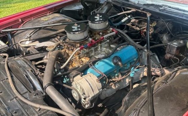 The rear fenders and tail lights are from a Cadillac. The rear bed door and bed may be from an El Camino, but there’s no way to tell. Why are there no photos of the bed? Does the cover have to be lifted up and off? If so, that would a tough job for one person to do. Why doesn’t the hood have a scoop over the carb breathers? That in itself makes it an ugly mod job. The weight of the mod job with anything in the bed would make that engine suck gasoline like flushing a toilet. I don’t see anyone jumping on this franken-toronado offer anytime soon.