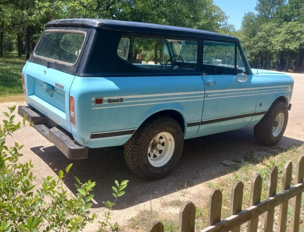 The interior has been upgraded with new black vinyl seats with white stitching and piping, as well as a new black carpet kit. The exterior has been updated with new 31–inch A/T tires, and a full length removable top. The seller reports that the tags expired on this Scout II 31 years ago and it has not been driven much. The odometer reading is over 100k miles.