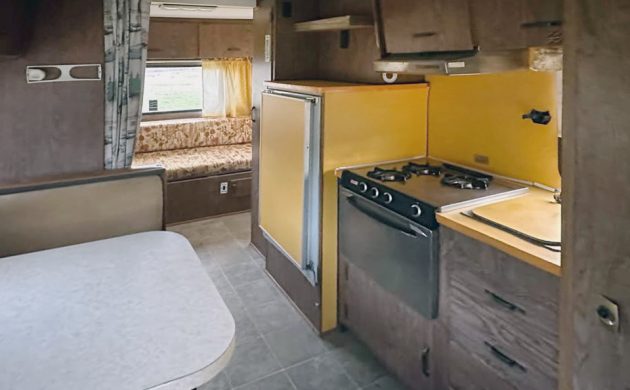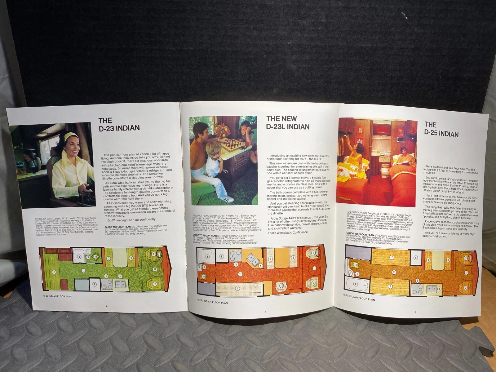 The seller has this RV listed as a D21, as in a 21-foot model, but I’m not positive if the mid-trim Indian series came in a 21-foot size in 1974. I can’t track down a 1974 brochure that shows a floor plan similar to this one with a front bathroom, and one that shows a 21-foot model. They all show 23-foot and 25-foot models.