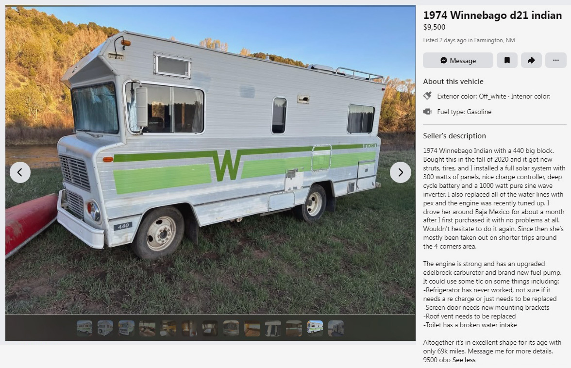 It’s that time of year again, at least for those of us in the snowbelt regions of North America. This is the time of year when a lot of us start thinking about summer, camping, fishing, and just getting away from it all. This 1974 Winnebago Indian Class A motorhome can be found listed here on Facebook Marketplace in Farmington, New Mexico, and they’re asking $9,500 or best offer. Here is the original listing, and thanks to T.J. for the tip!