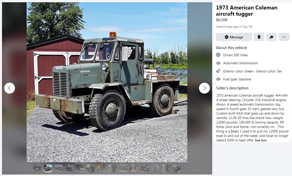 The seller has this cool, tough, unusual 4×4 tug with four-wheel-steering listed as a 1973, but the info included on the photo of the data plate shows it as a 1975, so that’s what I’m going with. This 1975 American-Coleman Aircraft Tug is listed here on Facebook Marketplace in Clay, New York, and the seller is asking $6,500. Here is the original listing, and thanks to T.J. for the tug tip!