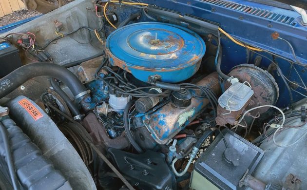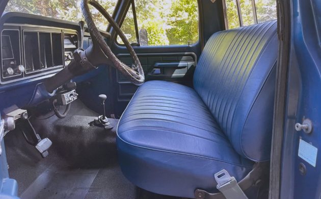 With a new seat cover, this interior looks pretty clean and nice, much nicer than the exterior of the truck looks. There’s only a transfer case stick on the hump, as this one has a three-speed automatic with a column selector. Hagerty is at $12,800 for a #4 fair-condition truck with a 360, just for the record.