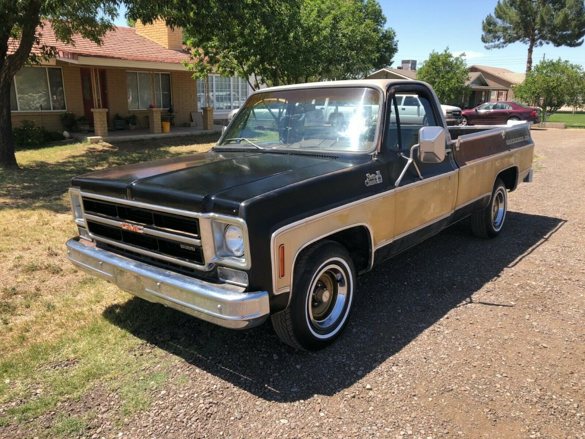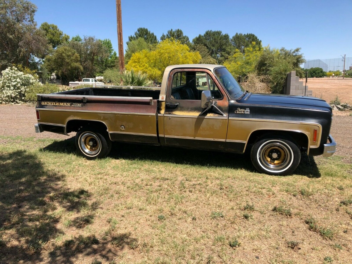 I have a ’79 GMC K1500 4×4. It’s the Sierra Grande package which is one off the bottom. In ’73 and ’74 the Sierra Grande was the full load but in ’75 they changed everything, making the Sierra the base, and The SG getting a nicer gauge cluster and color-keyed floormat. Then the High Sierra and Sierra Classic rounded everything out. Interesting that I looked at this truck for quite a while before I realized that it was black and gold. I think that was the only colors I ever saw this package come in. I ordered my truck with the regular deluixe tu-tone (brown metallic and calf scour yellow–GM wouldn’t want me in its color division).