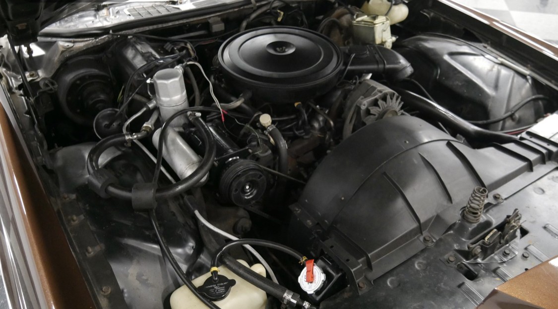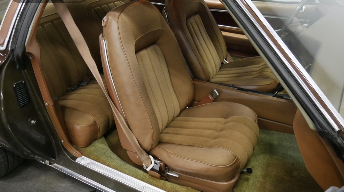 The Grand Prix was offered in three trim levels – the standard J coupe, the sporty SJ and the luxury LJ. This LJ interior is adorned with brown velour deluxe seats which matches the brown exterior. New features for 1975 included GM’s High Energy electronic ignition and a pollution control device known as a catalytic converter. Radial tires became standard on all models.