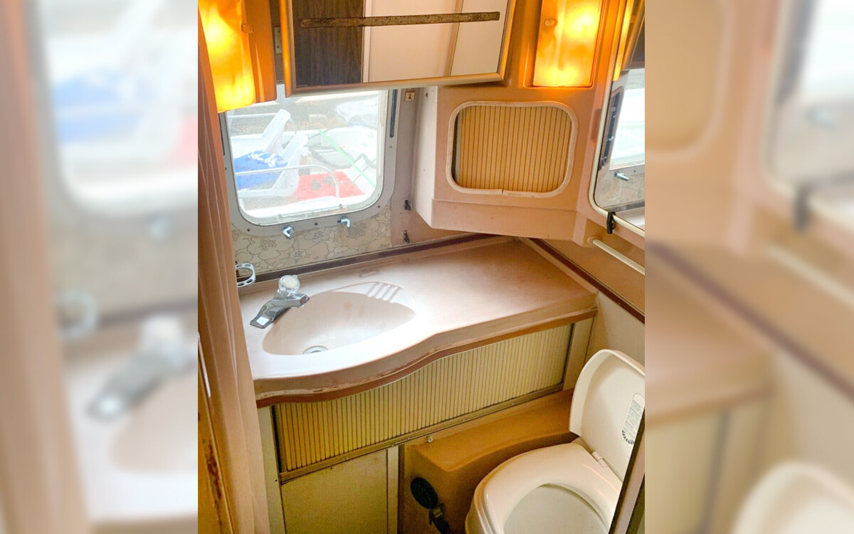 A four-burner gas cooktop is positively decadent! Well, not really, but for 1976, this is a nice little kitchen. It has almost everything a person needed in 1976 and probably for a decade after that, but times change and most people would have to upgrade parts of this interior. The seller says that it’s all original and everything works, so I’d leave it as is. The seller mentions a flatscreen TV, so it has that for a nice upgrade. Although a TV in my travel trailer would seem strange. That’s sort of the point of traveling I thought, to get away from blaring car warranty and walk-in tub commercials and things like that.