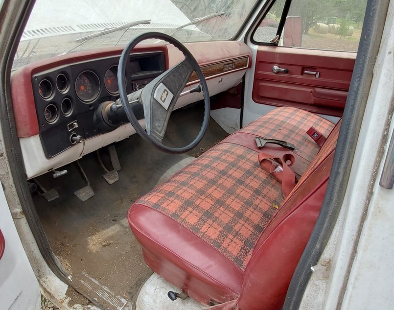 “Deluxe interior?” Hardly! Custom Deluxe was the base trim on Chevy trucks from 1975 to 1987. That’s plaid patterned vinyl seat upholstery, by the way.