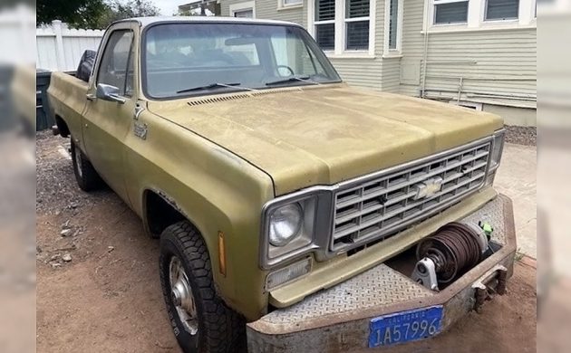 Yuba Gold is a great color for this 1976 Chevrolet K10 4×4 Short Bed pickup. The winch and big front bumper throw me off a bit. I did not expect to see that, especially on a short-bed truck. This one was made in California and appears to still be there, listed here on eBay in beautiful San Diego, California, where I should have moved after high school. The seller is asking $8,500 or best offer.
