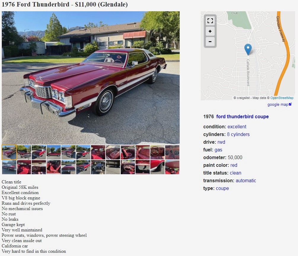 Coming in almost 20 inches longer than the previous T-Birds, the sixth-generation cars came along just as gas prices went out of control, and/or you couldn’t get gas unless you had a connection or didn’t mind waiting in line for sometimes hours. This drop-dead-gorgeous 1976 Ford Thunderbird can be found posted here on craigslist in Glendale, California, and they’re asking $11,000. Here is the original listing, and thanks to T.J. for the tip!