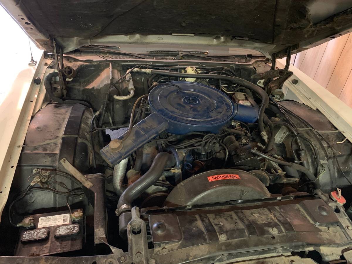 Under the hood is an 8 cylinder engine connected to an automatic transmission. The seller has recently replaced a few items because the car has been sitting in a garage for the last several years. A new battery, oil filter, and spark plugs have been installed. While the engine is not seized, it will not start and the seller is not confident in mechanicals to know how or why. They also note that there is very little rust on the car.