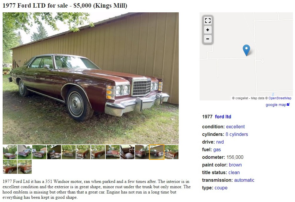 Apologies in advance for the photos of this 1977 Ford LTD; they aren’t the best. There is only one interior photo and, sigh, no engine photo. You’ll have to use your imagination, as the two biggest areas of concern, the engine and underside of the trunk lid (rust), aren’t shown. The seller has it posted here on craigslist in Kings Mill, Michigan, north of Detroit, and they’re asking $5,000. Here is the original listing, and thanks to Mitchell G. for the tip!