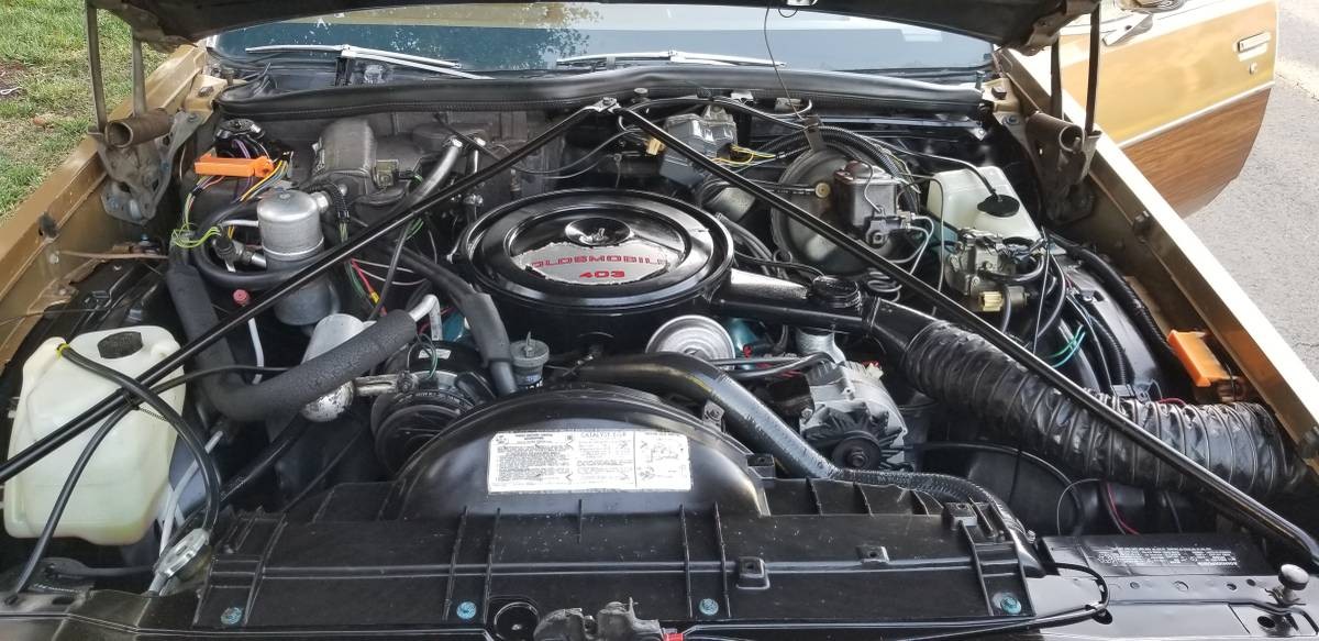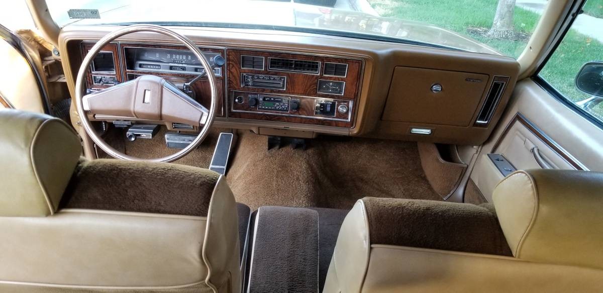 Powering this 4,000-pound boat is a 403 cubic-inch V8 engine that is connected to a 3-speed Turbo 350 automatic transmission. Service items and general maintenance have been performed including new front brakes, new tires, new ignition parts, an alignment, rear wheel cylinders, brake and radiator flushes, new spark plugs, cap and rotor, transmission service, and a new air filter. The car also has working “Level-Ride” air shocks controlled by a dial in the glove box.