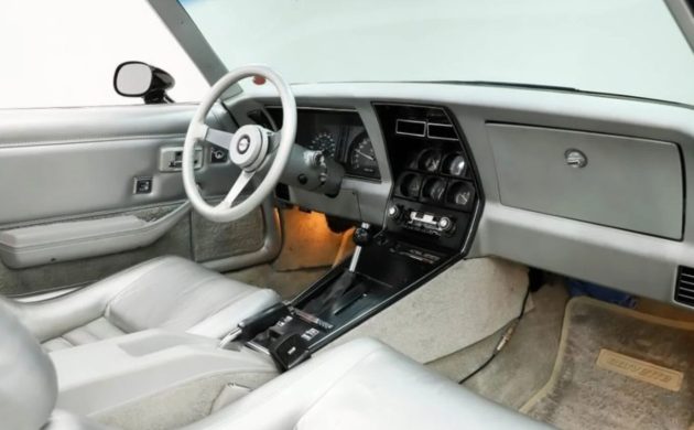 Air conditioning, power windows, power locks, cruise control, a leather-wrapped tilt/telescopic wheel, a rear defogger, and an AM/FM/CB radio with a power antenna. Those items confirm that this Corvette is nicely equipped for a classic of this vintage. The condition is also all that you might expect from a vehicle of this caliber. The Silver leather seatcovers look supple and inviting, with no signs of wear on the prone outer edges. The remaining upholstered surfaces are equally impressive, as are the dash and carpet. There’s a weird wire snaking its way along the passenger-side edge of the console, which doesn’t rate a mention in the listing. Otherwise, this interior is as it left the factory.