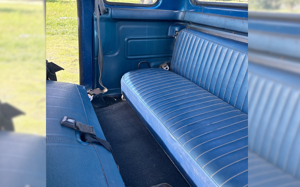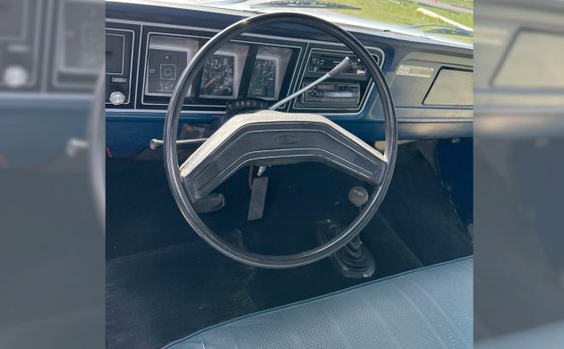 The two-speed manual… just kidding, that’s a two-speed transfer case, this truck has an automatic with a column shift. As expected for a Pacific Northwest vehicle, this truck looks great inside without a lot of the issues you’ll find in vehicles located in the desert Southwest. I think it’s the best spot in the U.S. for vehicles, but shipping can be a major buzzkill for those of us in the Midwest or the Eastern half of the country. The SuperCab space looks equally great, and that seat bottom folds down for carrying loads of stuff. The glove box door says “Custom,” which I assumed would make it a Custom trim with a Ranger package, but the Custom would have had round headlights for this one last year, and everything else says Ranger to me. Bob, help! One of you will know the exact trim and packages on this big, blue beauty. It’s wearing a Custom trim level vinyl seat, but also has carpet, and a Custom would have had black vinyl flooring.