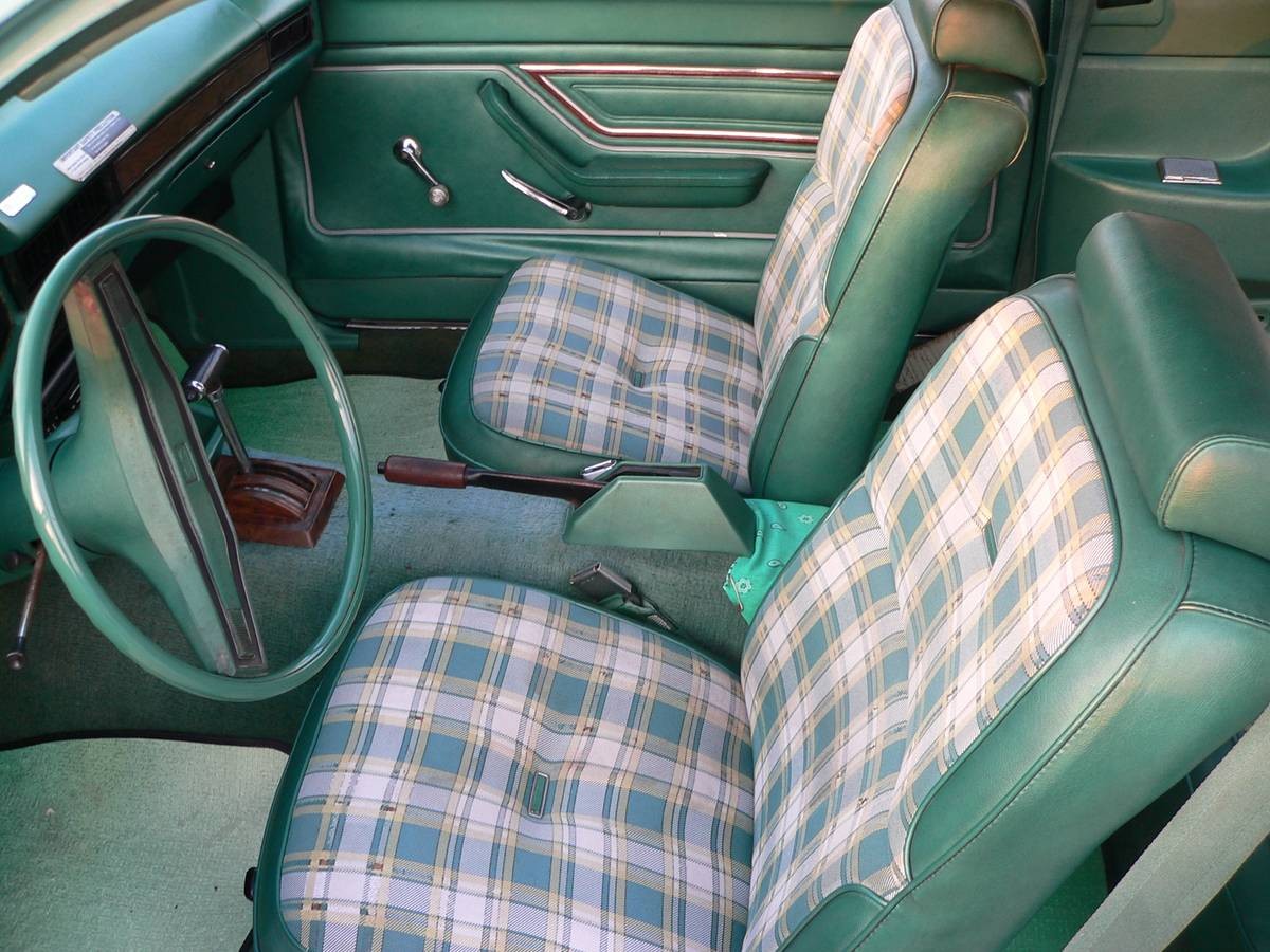 Mine wasn’t junk. For its day it wasn’t bad at all. I like the yellow one from a week ago better, I wouldn’t call it junk either. This one has its charms, a Squire in an unusual color with the oh-so-70’s plaid upholstery. Always good to see basic transportation cars which have survived.