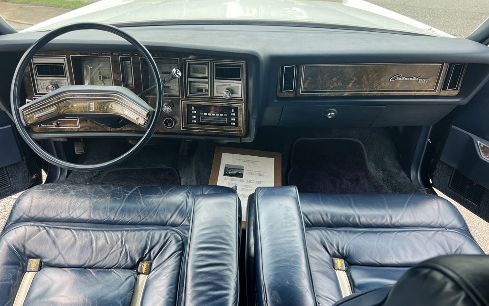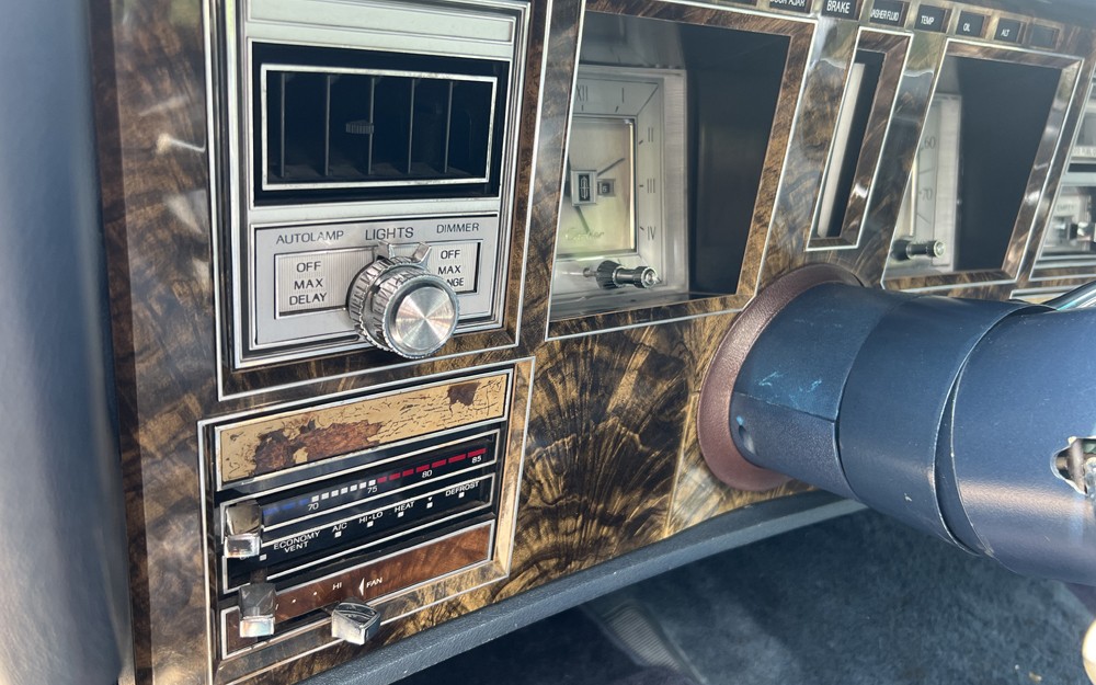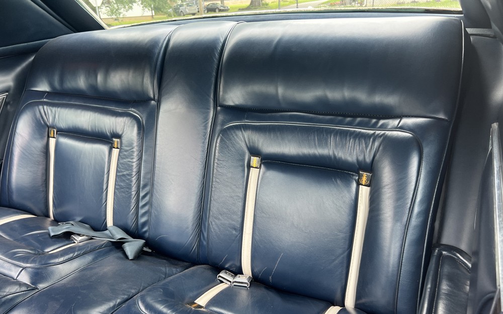 Here’s where your white-suit-wearing self will be sitting as you glide between the yacht club and country club. The special dark blue leather seats have William Ralph Bass written all over them, and they appear to be in nice condition. There was an opposite scheme with white leather and blue accents available in 1979. The back seat looks great, but the dash shows some deterioration on the faux wood trim.