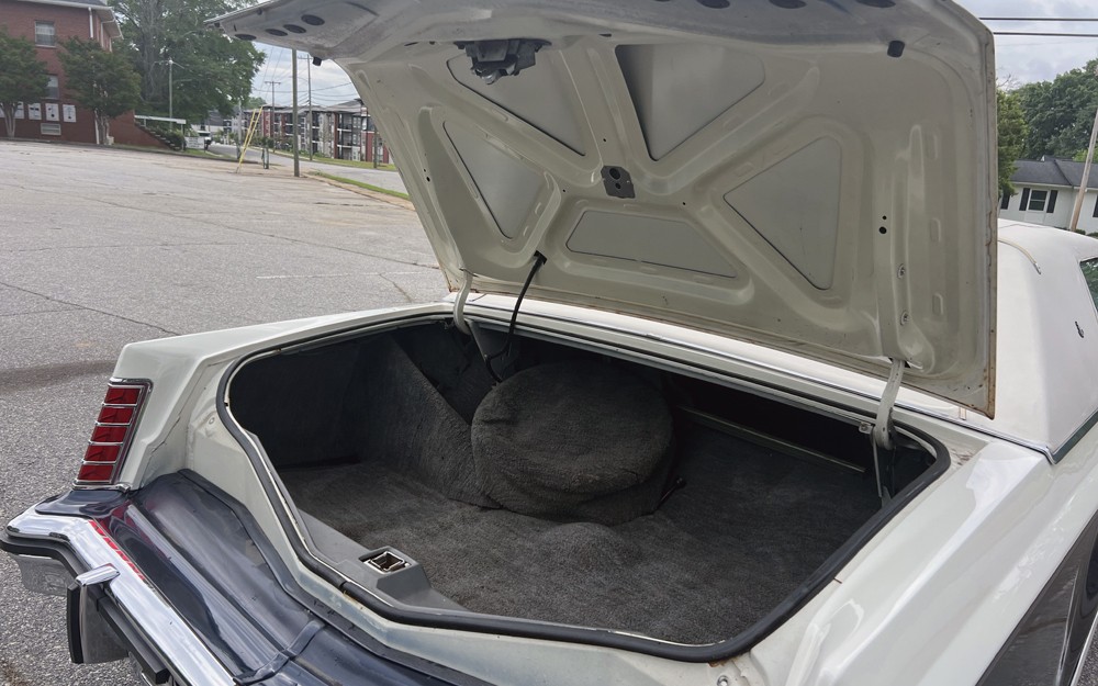 Advertising, being what it is, as in trying to sell something ASAP, can be misleading later in life. Some AMCs, especially their designer edition models, while cheaper when new, can be more valuable now than a Lincoln Mark V designer edition. This example looks great in almost all of the photos, including the trunk compartment. However, some of the paint around the unique keyhole appears to have been scratched and touched up, and a tiny rust bubble is visible above.