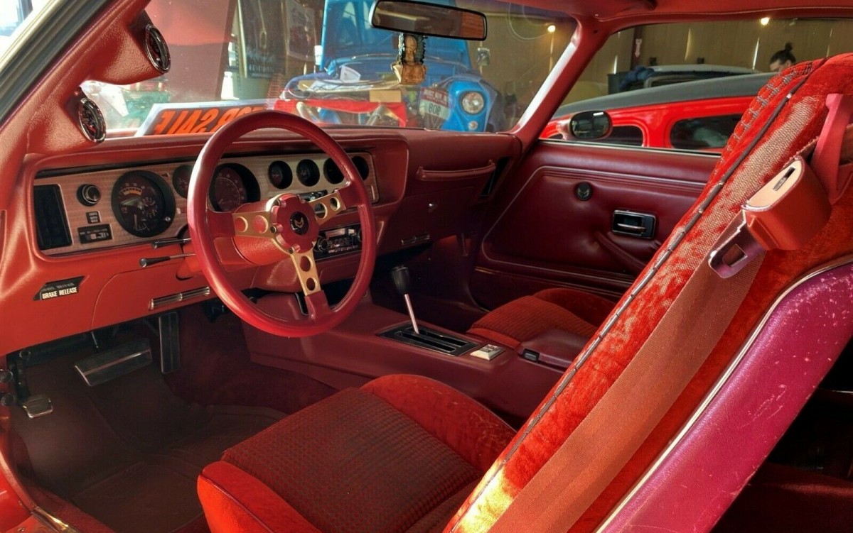 This Red Bird has traveled about 78,000 miles and about 4,000 miles earlier the V8 engine was rebuilt. The 301 cubic inch V8 engine car was rated at 155 horsepower and was designed for fuel economy. The seller states that the 301 cubic inch V8 engine was bored out .030 and received a Comp Cam (XE250), improved exhaust and the transmission was rebuilt with a shift kit. The suspension also received attention and the air conditioning was converted to 134A.