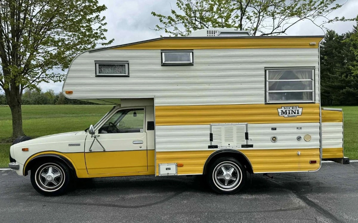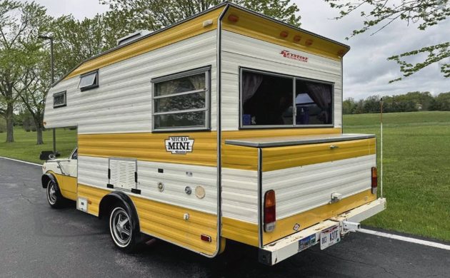 I know, the wheels throw me off, too, but those are the actual wheels and type of white-wall tires that came on this 1978 Toyota Keystone Micro Mini Class-C motorhome when it was new. I’m assuming the tires aren’t 46 years old, but the seller doesn’t mention this one as having new tires on the list of recent maintenance. It’s posted here on eBay in Broadview Heights, Ohio, and they’re asking $16,500, or you can make an offer.