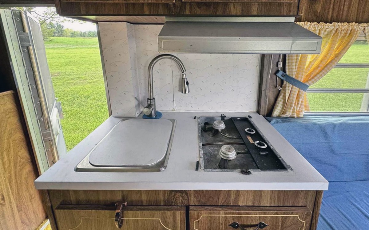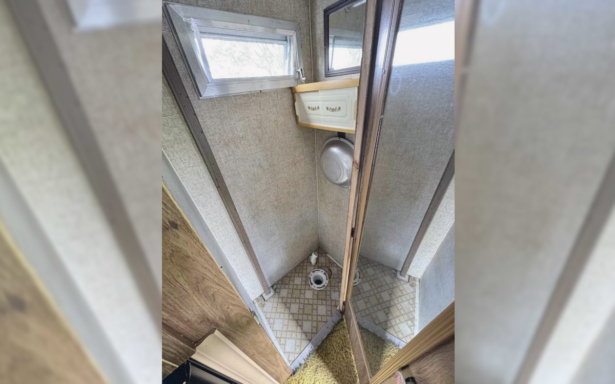 If I didn’t know better, I’d swear those dimples on the side were made with a BB gun…still a nice rig though! Shouldn’t be too difficult to find an RV toilet to put in the head, everything else looks pretty clean and usable.