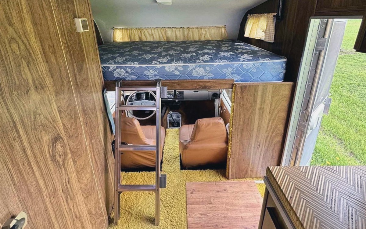 I normally like things 100% original spec, but I’m not a fan of those wheels and white wall tires at all. I’d probably keep them in storage while having another set on here, as weird as that sounds. Otherwise, this yellow and white Class C motorhome, or camper, looks fantastic to me. The added storage “box” on the rear gives a buzzkill to installing a ladder to the roof, but then again, you don’t need rooftop storage with that compartment on the back.