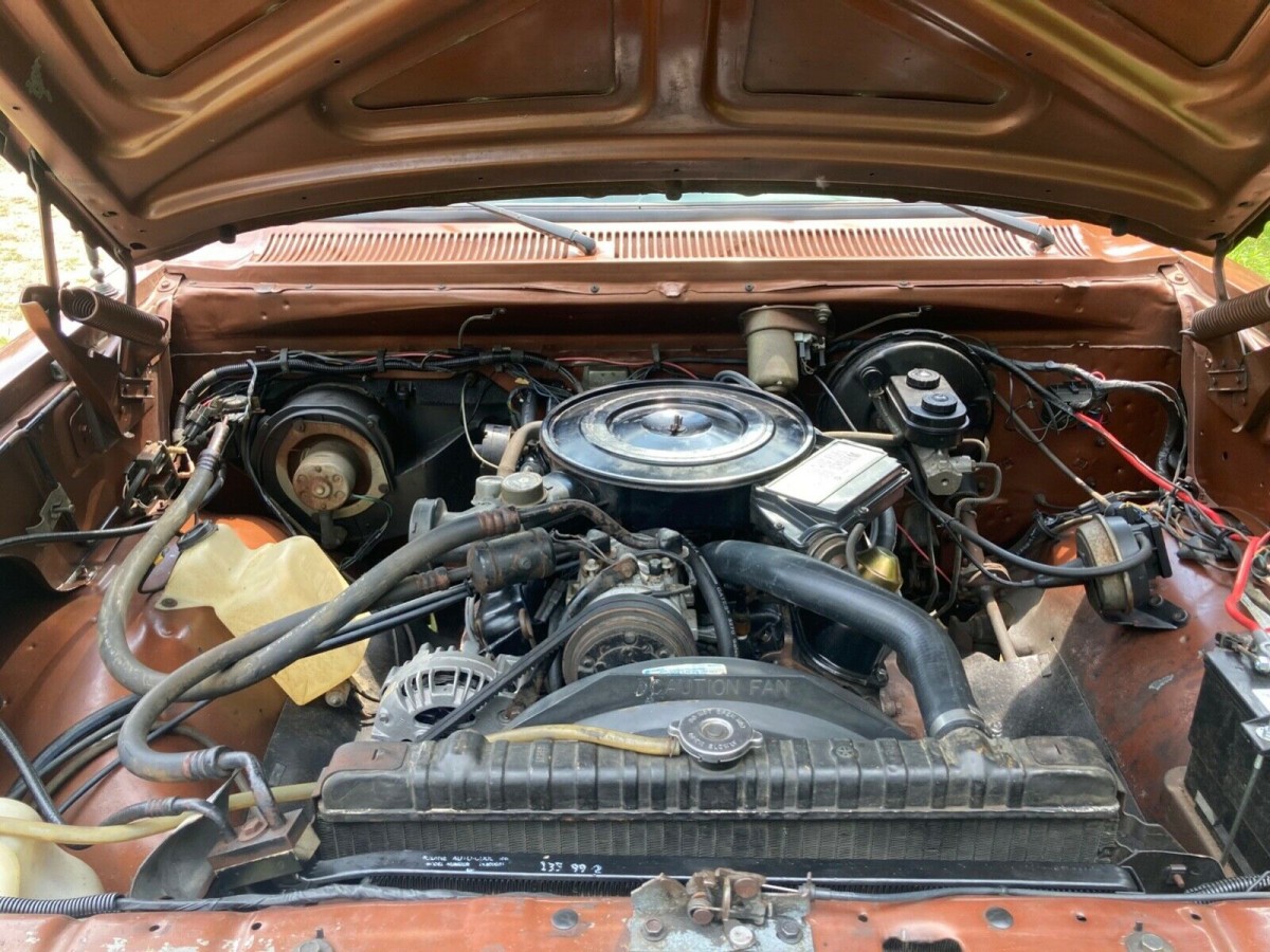 The interior very nice and shows well. Dodge built pretty simple, straight forward designs when it came to the interior. The bench seat is starting to show extensive wear on the driver side and the door panels shows sun fading. The truck is optioned well with the gauge package, cruise control, air conditioning and an aftermarket Alpine radio. The truck has manual windows and the air conditioning system has been converted to R134. I had a friend in high school that had a SWB Ram truck like this but it had the slant six engine and was a few years older. It was dependable but pretty slow with only a six cylinder.