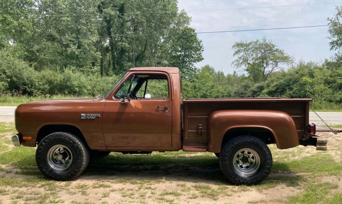 The exterior of the brown Ram truck looks pretty nice with 15 inch chrome wagon wheels and oversize Cooper Discovery ATX tires. The pictures indicate that the undercarriage is very clean and no rust can be seen on the body panels or undercarriage. This would make a nice truck for cruising or for work. It should have plenty of life left in it.