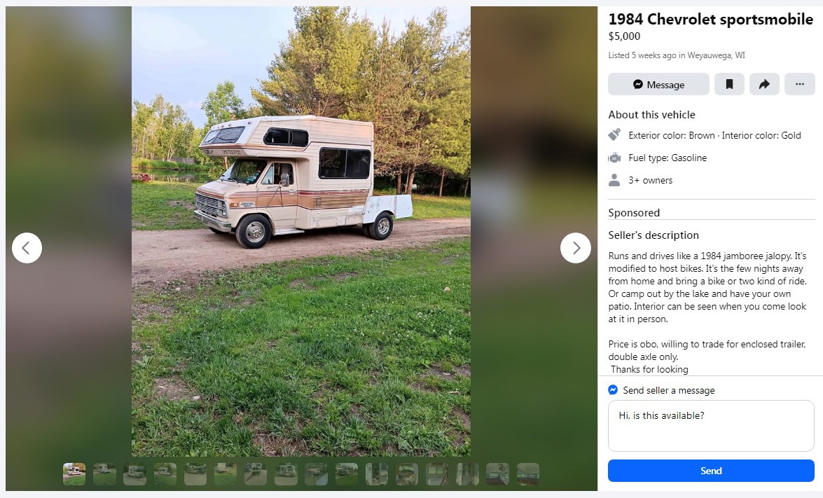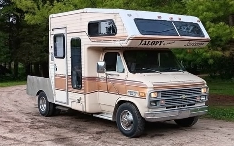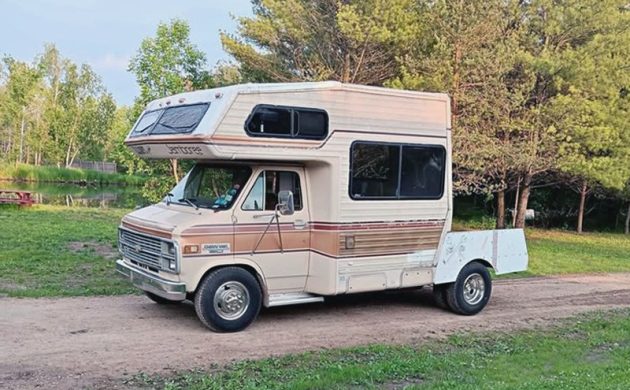 We don’t know what’s powering this RV, but here’s a really nice one, also on Facebook Marketplace, with the whole motorhome there, for $8,000. I’m guessing the engine would be a 350, but there was a 454, but it was supposedly not available in 1984. There was also a 6.2-liter diesel available in 1984, but you’d think the seller would have mentioned that. They do say that it runs and drives like a Jamboree should, so that’s good. Any thoughts on this cropped RV? What would you haul in the back?