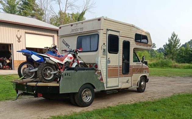 Coming in at almost the best of both worlds, this custom-cut Class-C motorhome has had the rear end sawed off (that sounds painful), and they’ve created an outdoor hauling platform for your motorsports toys. This 1984 Fleetwood Jamboree custom motorcycle hauler RV is listed here on Facebook Marketplace in Weyauwega, WI, and they’re asking $5,000 or best offer. Here is the original listing, and thanks to Lothar… of the Hill People for the tip!