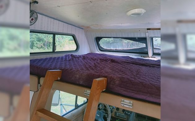Fleetwood motorhomes are known for quality, and the Jamboree line was no exception. A 41-year-old motorhome, even with the rear portion intact, won’t be like a new one, so you have to expect some compromises. And when you cut off the bathroom, kitchen, and other areas, the inside is mainly for lounging and sleeping. Still, this is so much better than a tent. I’d want to make sure the roof doesn’t leak. There’s something going on at the right front ceiling of the overhead sleeping area. If you click on the link and check out the photos, you can see that.
