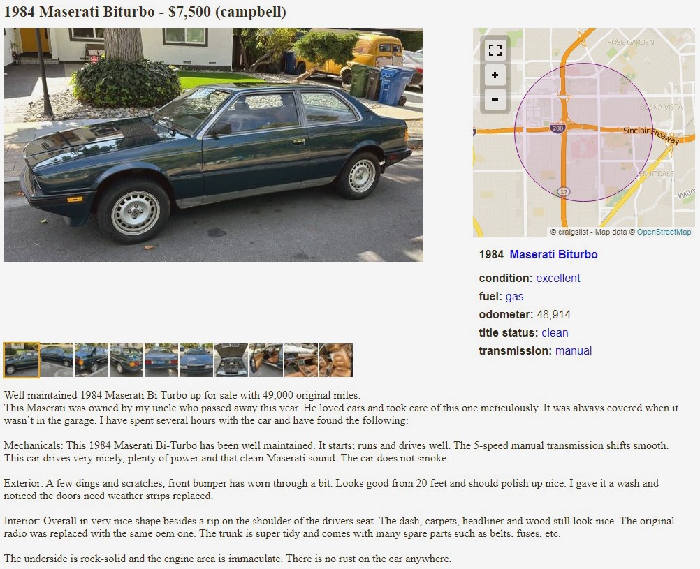 We’ve seen several examples of Maserati’s early version of their sleek two-door “exotic” twin-turbo, literally named the Biturbo, and they’re always interesting. It’s probably more interesting to dream about owning one than to actually own one, but that’s often the case, as most of you know. This 1984 Maserati Biturbo is posted here on craigslist in Campbell, California, and the seller is asking $7,500. Here is the original listing, and thanks to Mitchell G. for the tip!