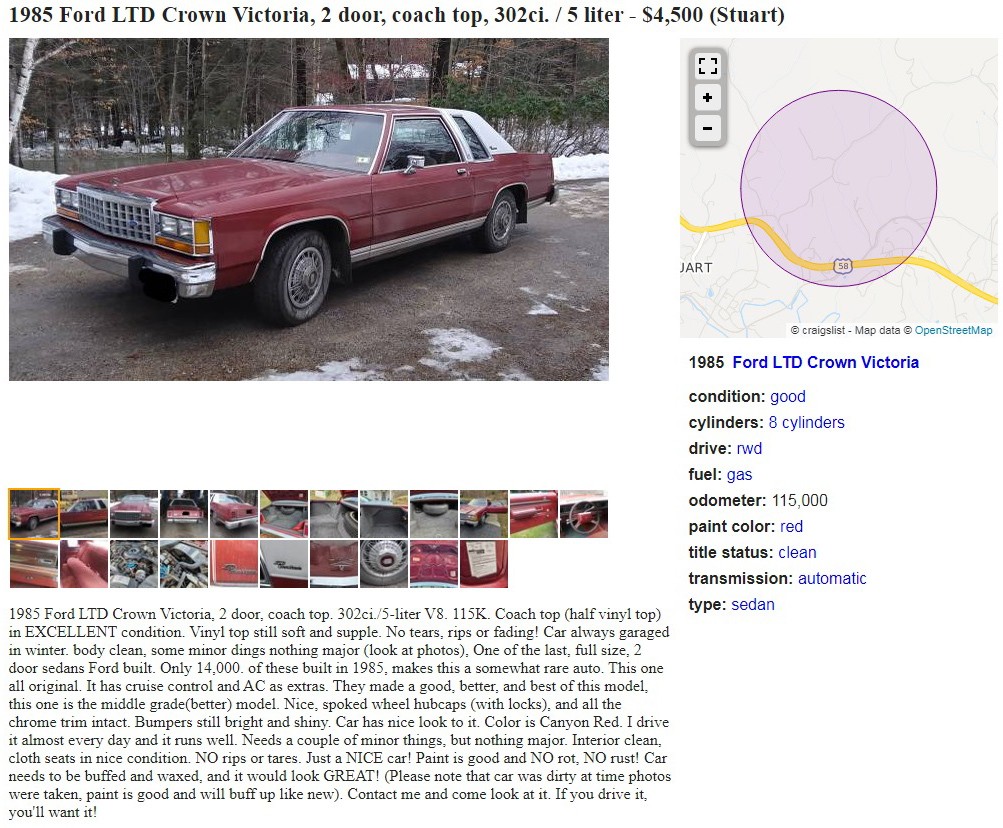 Good job Scotty. This looks like a decent Crown Vic. The ad has quite a few pics and a good write-up, which makes the fact that the pics were taken when it was dirty quite odd. An engine detailing would be welcome, and probably a few other things to sort out. Whitewalls please. The result would be a nice cruiser.