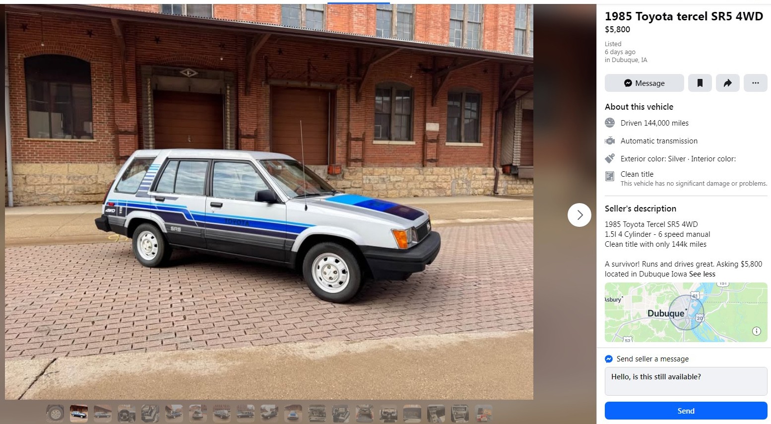 Fans of 1980s vehicles with heavy graphic packages unite, this is one throwback ride! I can faintly hear Tears for Fears on the stereo as I check out this 1985 Toyota Tercel SR5 AWD Wagon. This wayback machine is posted here on Facebook Marketplace in Dubuque, Iowa, and they’re asking $5,800. Here is the original listing, and thanks to Lothar… of the Hill People for the tip!