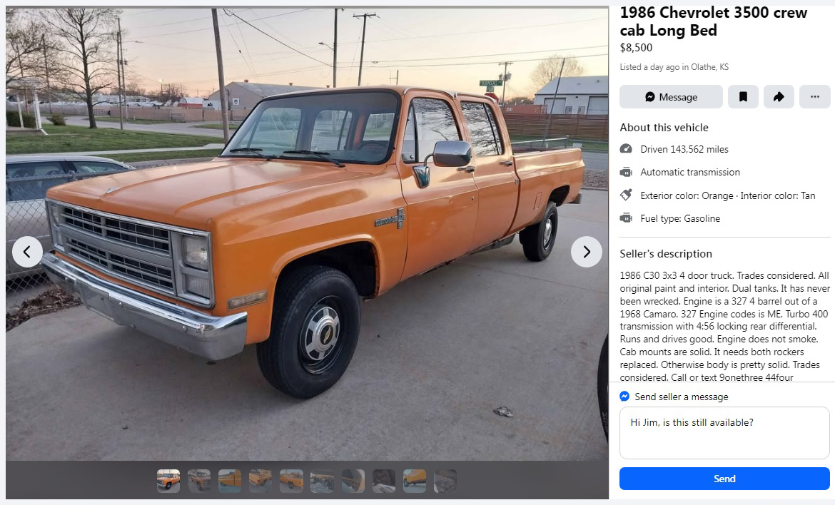 “A 327 V8?! What’s in your coffee this morning, Scotty G? They didn’t offer a 327 V8 for this truck in 1986, you meatball!!” Ok, ok, the engine is out of a 1968 Camaro, how’s that for a cool transplant? From what I can tell, it would have had 275 horsepower, more than the ’86 454 V8. This 1986 Chevrolet C30 Custom Deluxe 3+3 Crew Cab can be found here on Facebook Marketplace in Olathe, Kansas, and they’re asking $8,500. Here is the original listing.