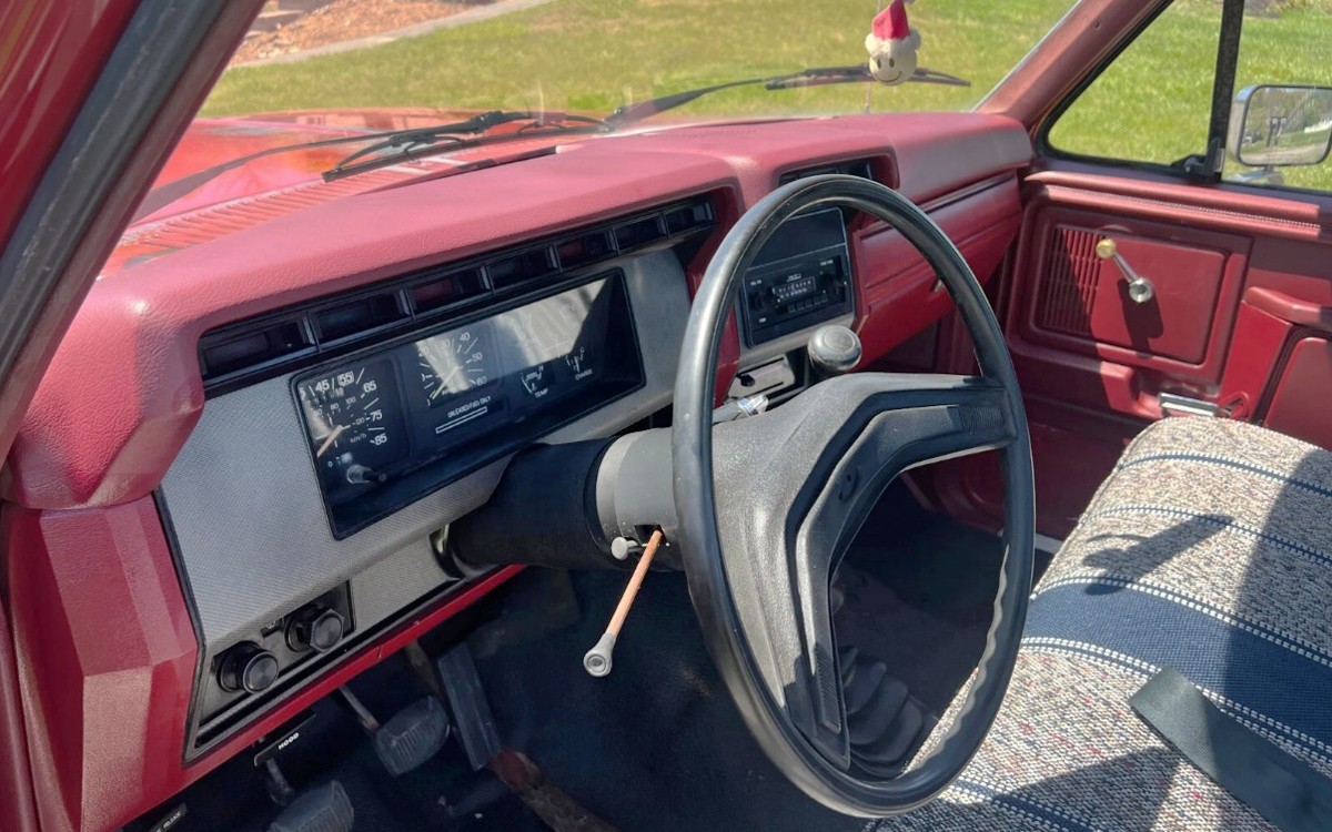 Inside the short bed looks good, but with a heavy coat of surface rust, and inside the truck cab looks even better. A big thing with this truck is the four-speed manual, which I believe is a T-18 with a low “granny gear”, or as the seller says, a bulldog gear. This is a seventh-generation F-Series, and they were made from 1979 for the 1980 model year, until the end of 1986 here and longer elsewhere.