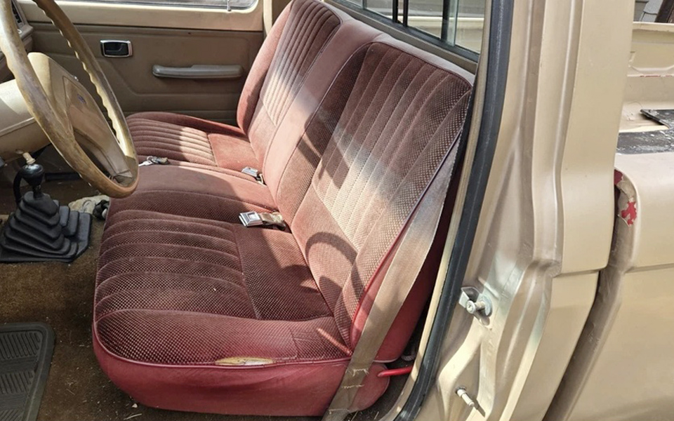 The red seat stands out a bit, but there’s no mention of it. I believe it should be Chestnut. I’d want to source a correct seat and detail the heck out of this Ranger before tackling that floor rust, just to see how nice it would look. The five-speed manual and two-speed transfer case shifters are seen here.