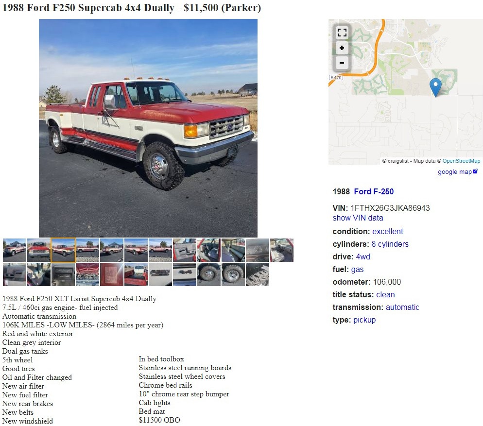 What a nice truck! I should probably be more objective, sorry about that. This 1988 Ford F-250 XLT Lariat 4×4 SuperCab Dually looks perfect in Scarlet Red over (and under) Colonial White and I wouldn’t change a thing, even though it’s showing some fading on the top of the hood. The seller has it posted here on craigslist in Parker, Colorado and they’re asking $11,500. Here is the original listing, and thanks to Mike F. for the tip!