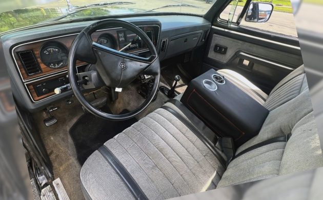 The interior looks fantastic from what we can see, with nice fabric seats with vinyl accents – fancy for a pickup in this era, not so much today when everyone wants full leather. This one doesn’t have a floor-shifted manual transmission, unfortunately, but the heavy-duty TorqueFlite A727 automatic was up to the task of backing this powerful engine. I don’t see a flaw inside, do you?